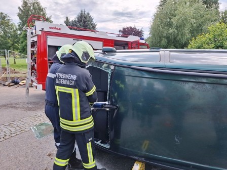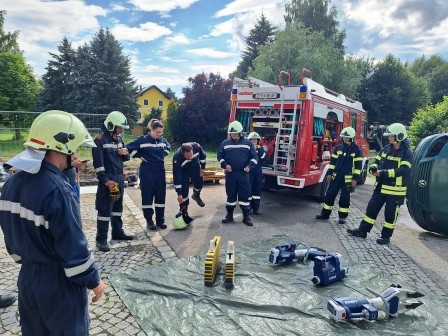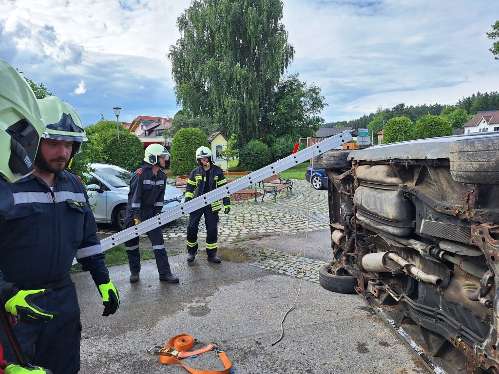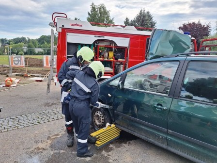 Leiter gesichert und danach die Rettung einer eingeklemmten Person aus dem Fahrzeug geübt. Nach erfolgreicher