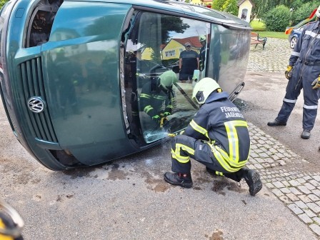 Rettung der Person aus dem Fahrzeug wurde das Fahrzeug wieder auf die Räder gestellt. Im zweiten Teil der Übung kam der neue Rettungssatz voll zum Einsatz: Die Türen wurden geöffnet und das Fahrzeugdach entfernt.